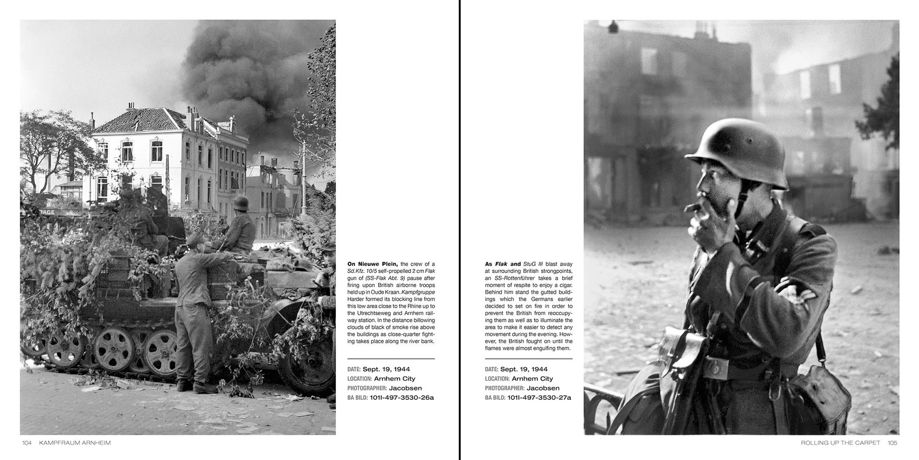 Kampfraum Arnheim (Battle Zone Arnhem), is a unique in-depth photographic documentation of the German ground forces which opposed the Allied Airborne landings in Holland in September 1944. Their response to this Anglo-American offensive, code-named “Operation Market Garden,”was chronicled by eight German war correspondents whose 16 rolls of film are the primary focus of this publication. The material was acquired exclusively from the German Federal Archives and depicts Heer, Luftwaffe and Waffen-SS troops in action at Arnhem, Nijmegen, Mook and Osterbeek.