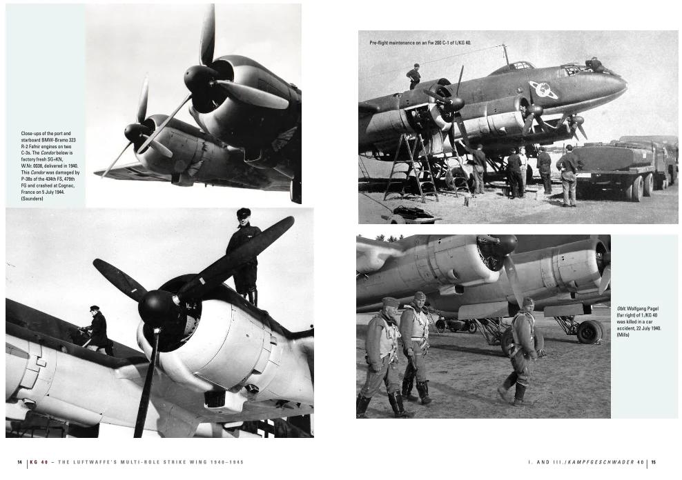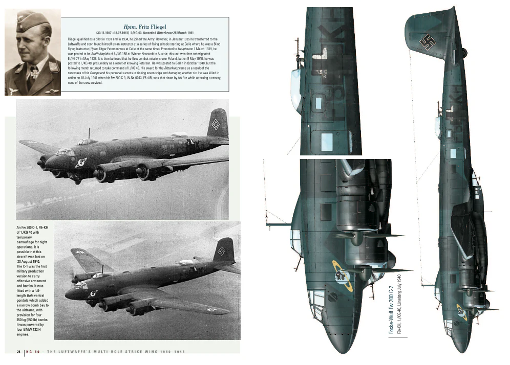 Drawing on many years of research including interviews and correspondence with former aircrews, private accounts, unit records and reports, aviation historian Chris Goss presents the history of Kampfgeschwader 40 (KG 40), the Luftwaffe’s principal maritime anti-shipping unit and multi-role strike wing. KG 40 was formed in 1940 and operated successfully in the campaigns in Norway, the seas around Great Britain, over the Bay of Biscay, the Atlantic and in the Mediterranean, including missions over North Africa,and for a short time the Soviet Union. At various times the unit was equipped with the He 111,Fw 200, Ju 88, Do 217 and He 177. During the first half of the war, its four-engined, long-range Fw 200 Condors operated far out into the Atlantic, attacking merchant shipping and accounting for thousands of tons damaged or sunk. The unit also operated the Do 217 and He 177 bomber types, the latter armed with the latest, state-of-the-art guided bombs against maritime targets in Great Britain and the Mediterranean. Its Ju 88 C-6 ‘heavy’ fighters patrolled the waters of the Biscay from 1942-1944, protecting U-boats and Axis shipping and taking a heavy toll of Allied aircraft.